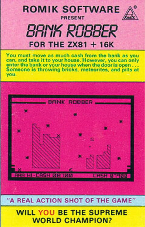 Bank Robber is a variant of Commodore’s Money Wars. The player controls a man who has to move money from the bank to his home. The bank is located on the left side of the screen while the home is located on the right side. The buildings can however only be entered when their doors are opened. From the sky, meteorites are falling and the player has to avoid being hit by these while moving across the screen. Getting hit means a life is lost. Other things falling from the sky are pills that give an extra life when eaten and bricks that when caught builds or repairs one of three protection buildings (similar to the shields in Space Invaders). At the end of the game the player gets a ranking depending on the amount of cash that has been collected.