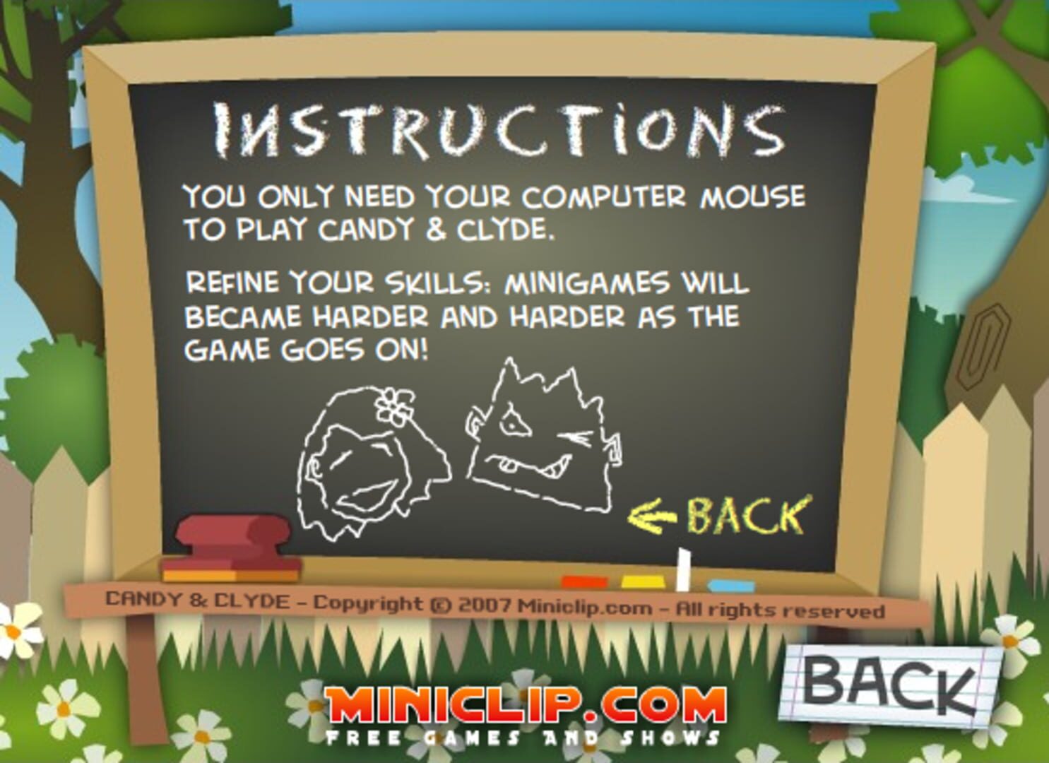 In this flash game game, you must help Candy & Clyde through a variety of different tasks, chores and games. For each task, you can choose to play as either Candy or Clyde and the task will be slightly different depending on who you choose. Candy is nice and sweet and is always trying to help others. Clyde is mean and is always trying to hurt others. Your goal is to complete each task as quickly as possible and score as many stars as you can. The games start out very easy, but get harder and harder as you go on.