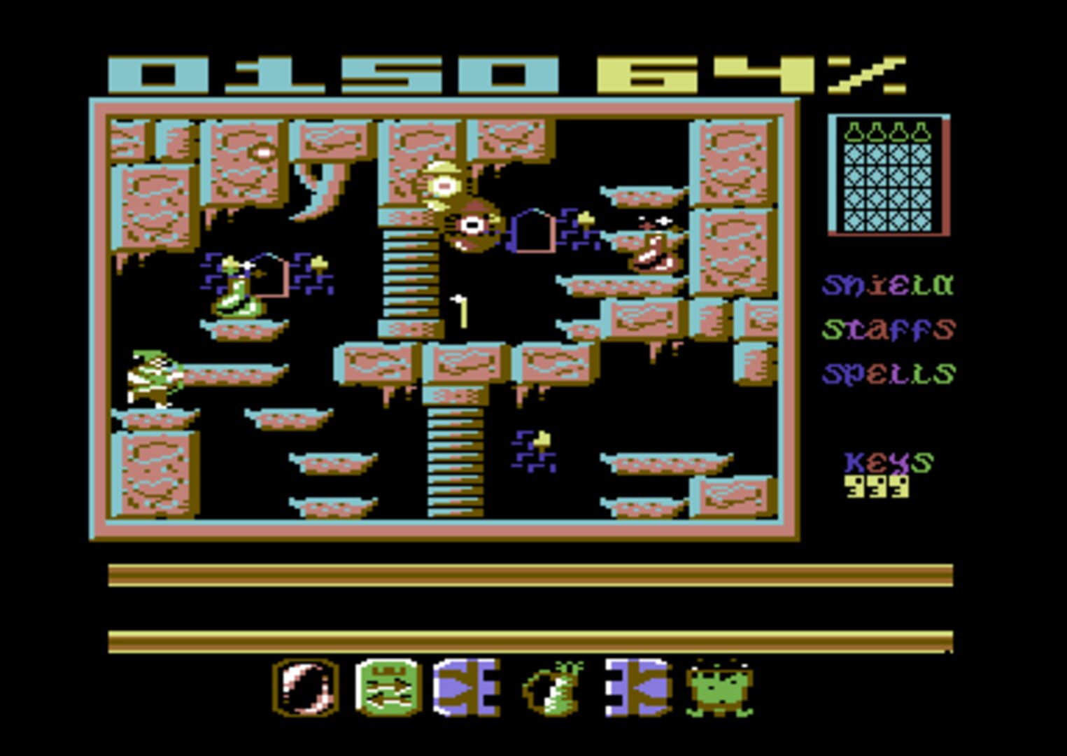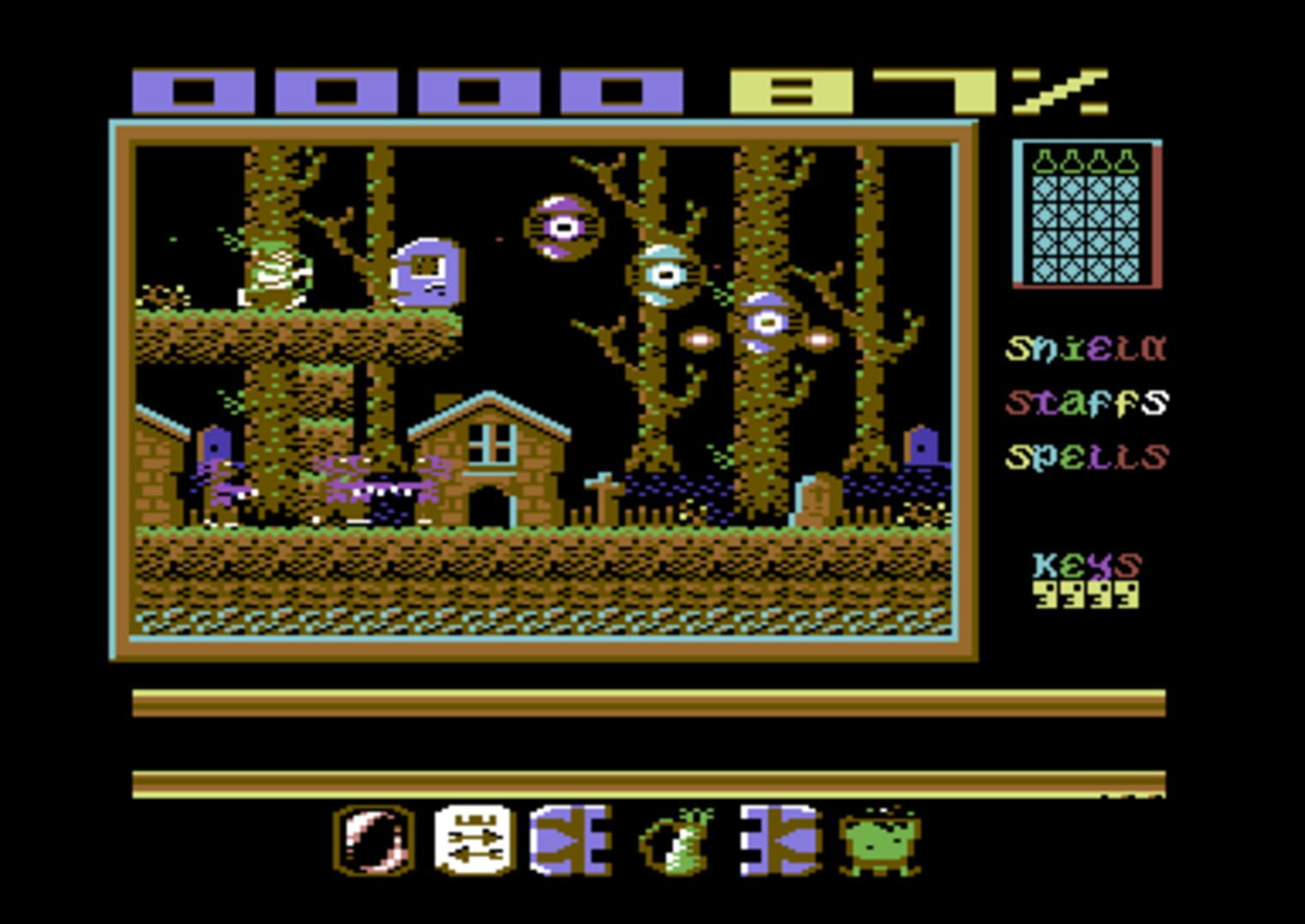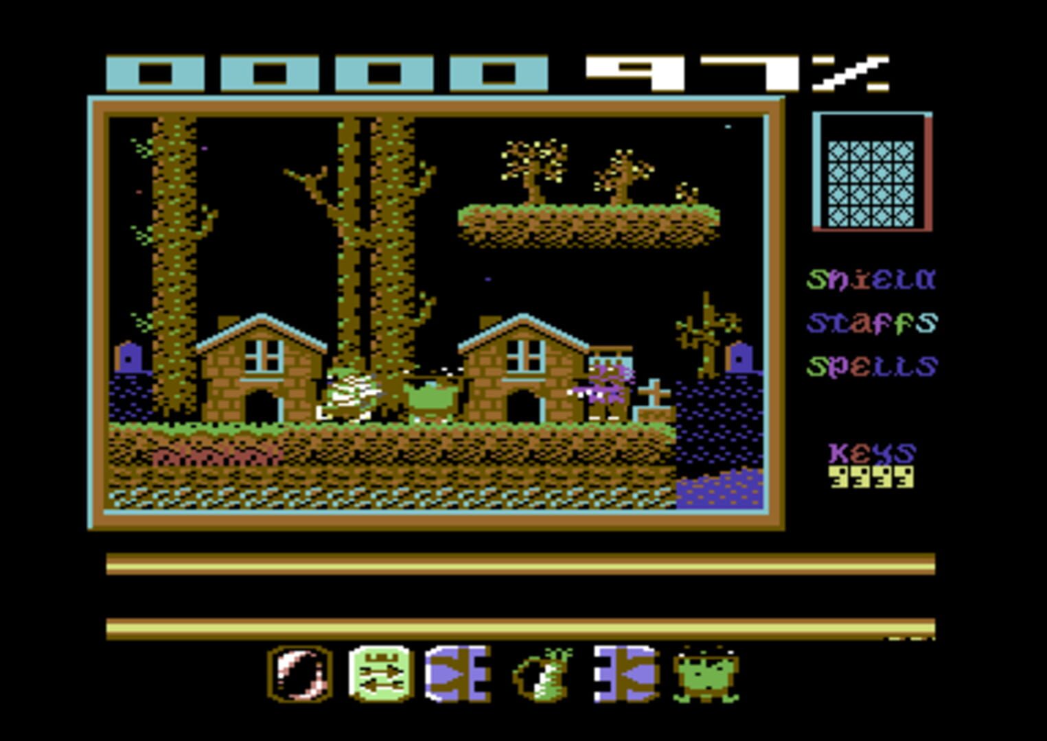 Elven Warrior is a flick-screen platformer where you play the role of Elf as you explore the land and the underground passages for various bottles of potion to fill a cauldron up. As you search the land there are various creatures that must be avoided or shot with one of various limited weapons that can be found and collected, a long bow, staffs or axes. If you touch a creature then you lose part of a health meter but if you fall into water or touch spikes then this empties the meter and it is game over. On the surface of the land are various doors which take you underground but keys are needed to open them which can be found in various locations. Once you find a bottle then you take it back to the cauldron and this then opens up other parts of the area when full.