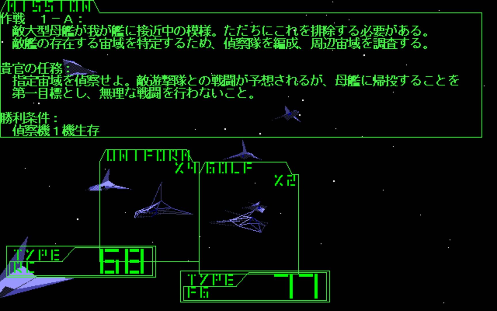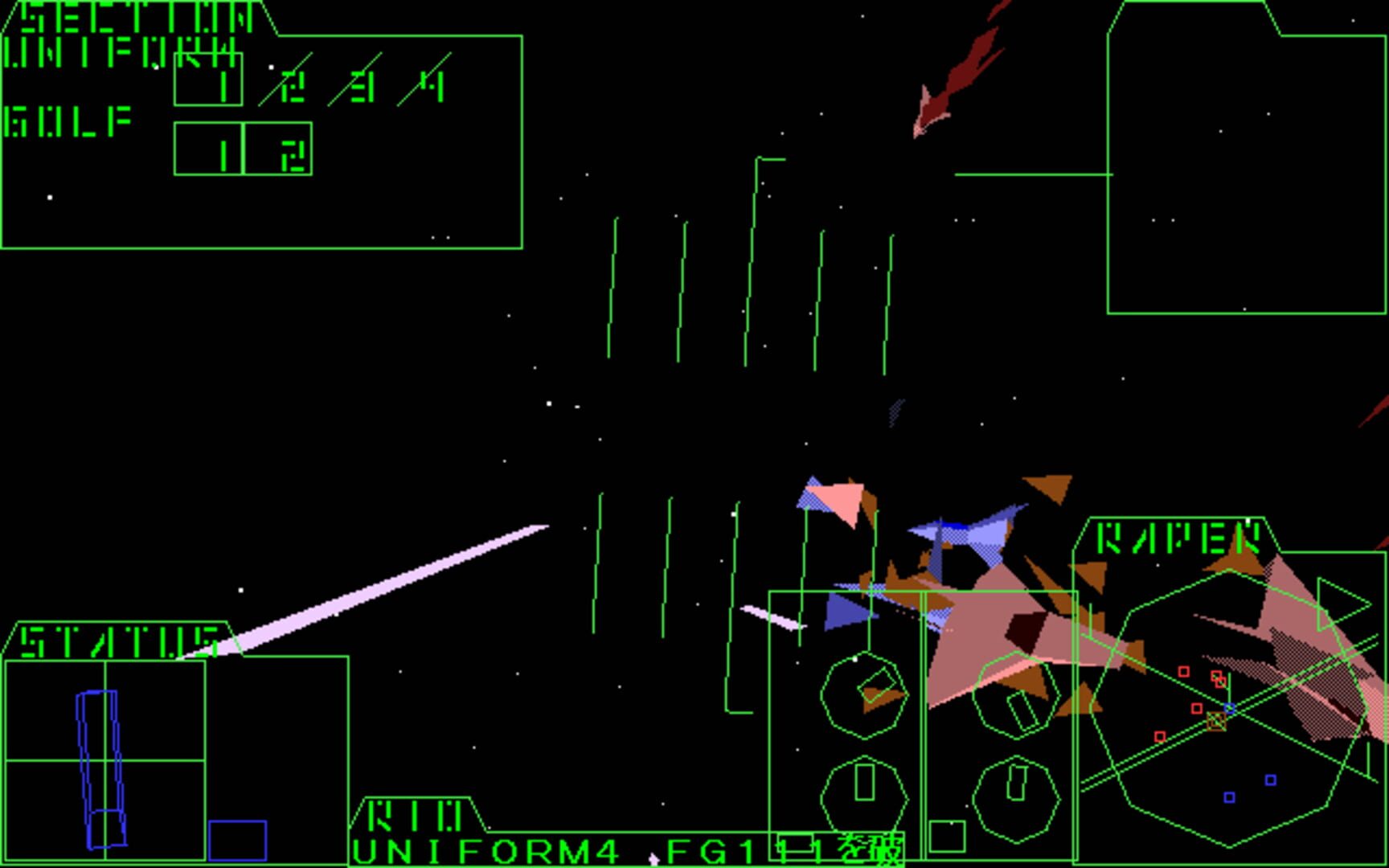 In this early 3D vector shooter by Kenta Cho (ABA), you pilot a space fighter battling increasingly challenging waves of enemy ships. The game uses flight-sim controls, multiple view modes, and simplified physics simulation, much like earlier influences such as Star Luster. You have both lasers and lock-on missiles for eliminating all 12 types of enemies. Protect your comrades, take down those cruisers, and aim for the highest scores!