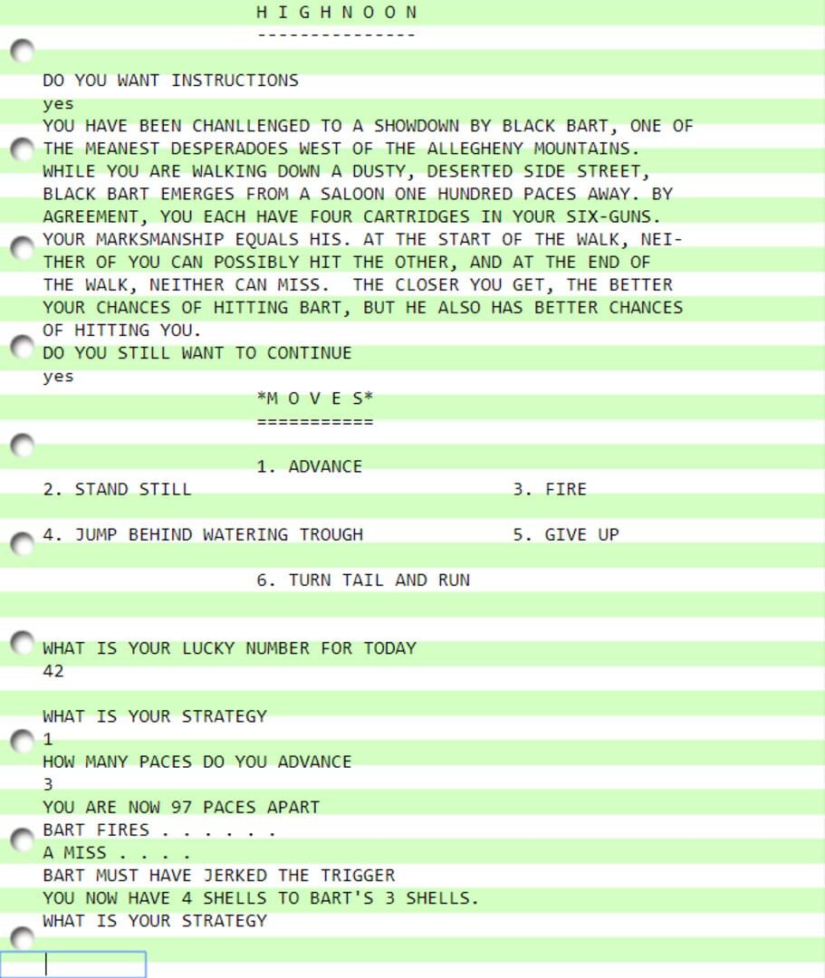 Highnoon is a BASIC game developed by Christopher Gaylo from Syosset High School, New York in early 1970 on a timeshared mainframe computer. The game is single-player and set in the Wild West in 1889.