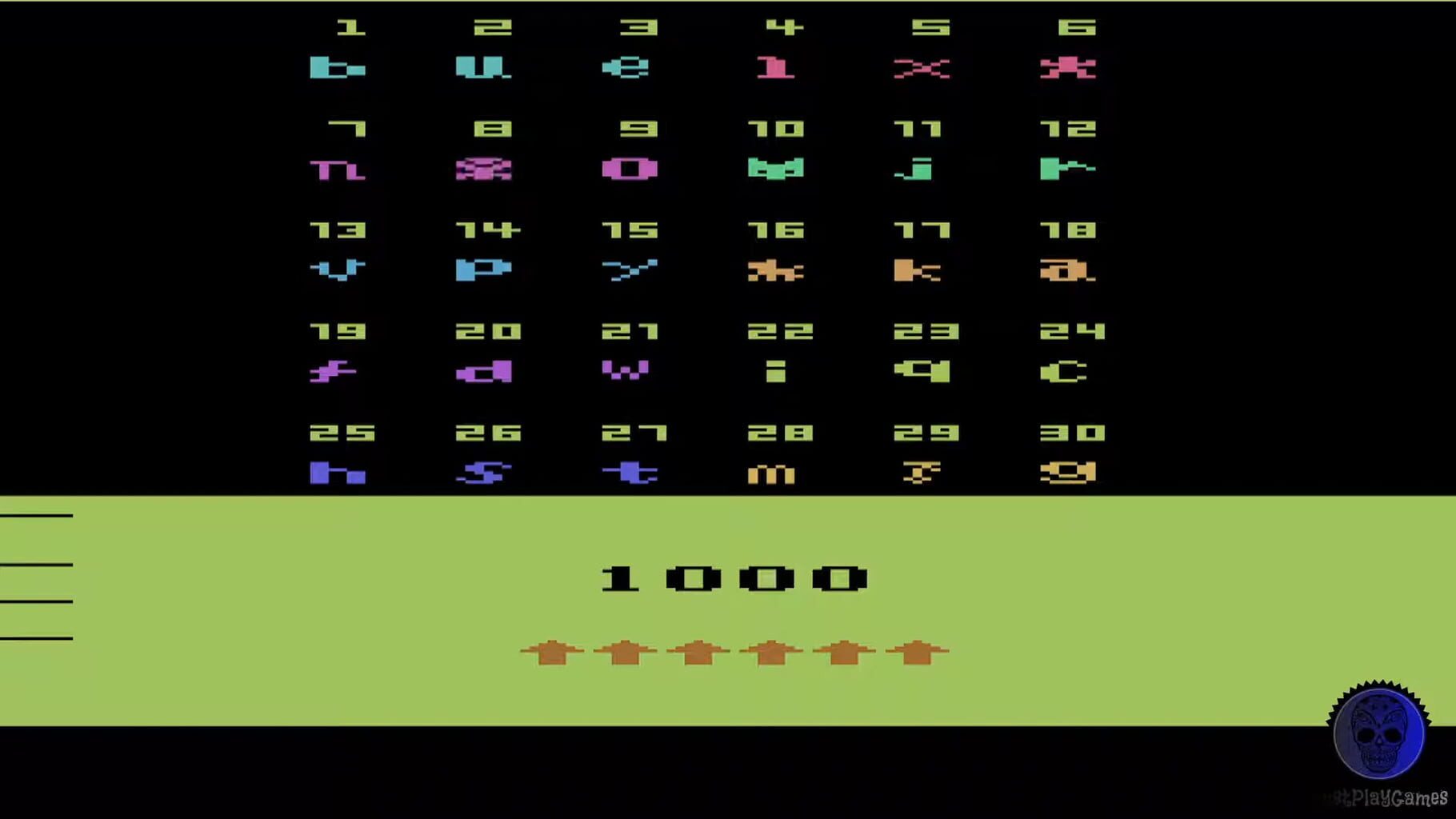 The title screen shows us 25 letters of the alphabet (where did the Z go?) and 5 symbols, representing little figures. If you press F1 to start, you will see the first screen with all the letters and symbols randomly presented and numbered from 1 to 30. If you move the blinking cursor with your joystick down (in the direction of the red arrows), the second screen will appear with the same letters and symbols also numbered 1 to 30, but in a different order. You will also be confronted by a horrible tune. While the tune is playing, you will have to memorize the positions of the letters and symbols of both the screens by looking at their corresponding number (use your joystick to move the cursor in the direction of the arrows to let the other screen appear) or just write down the thirty letters and symbols of one screen on a piece of paper. When the tune stops, all the letters and symbols of both screens will change into little squares and a timer will count down from 1000 to 0. You have to memory match the same letters (or symbols) by pressing fire when your cursor is on the correct square. When two letters (or symbols) match, you will get 1 point and the two matching letters (or symbols) will stay on screen. When the two letters (or symbols) don’t match, they will change into little squares again. If you manage to match all the thirty letters and symbols before the timer reaches zero, you will be confronted by another horrible tune and the game will end. If you do not manage to match all the thirty letters and symbols before the timer reaches zero, you will still be confronted by the same horrible tune and the game will end. When the game has ended you are still able to move the cursor and change squares into letters (or symbols).
