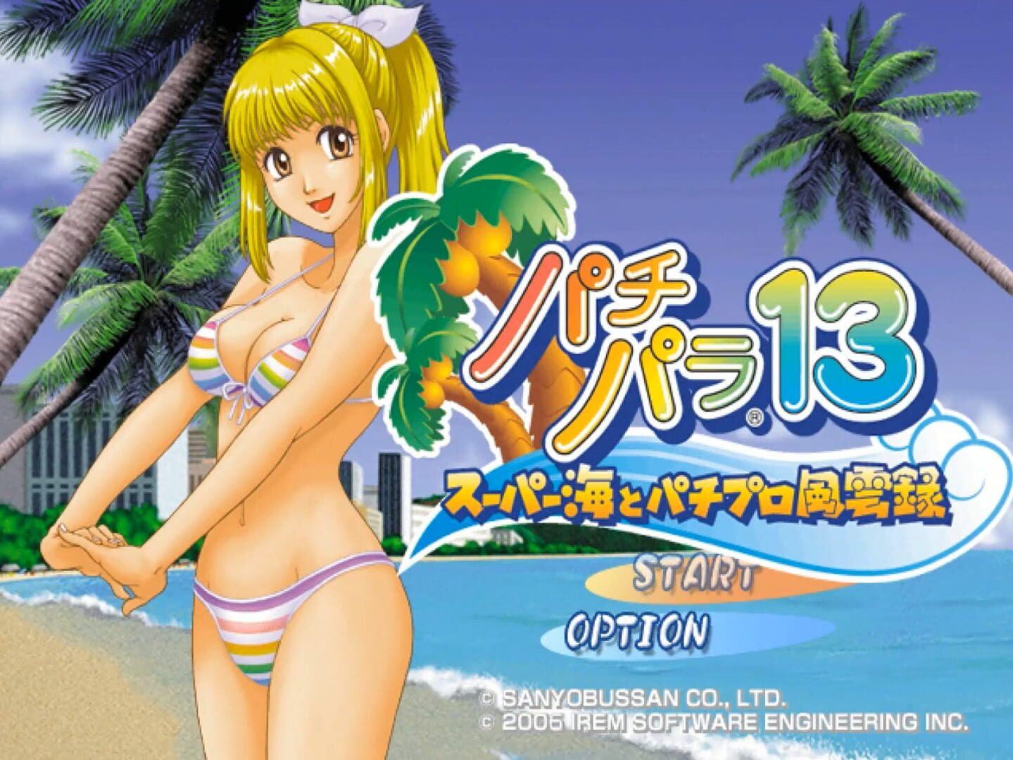PachPara 13 is one of the many titles in Irem’s long-running pachinko simulation series. It features faithful 3D recreations of two pachinko machines made by Sanyo Bussan: CR Super Umi Monogatari M55W and CR Super Umi Monogatari M55X. There are two modes available: Tsūjō (Normal) mode allows the player to modify a wide range of settings for each machine, while Jissen (Battle) mode challenges the player to win as many balls as possible on the default settings with a limited starting pool and time limit. There is also a View mode where the various animations that play on the in-game display can be freely viewed.