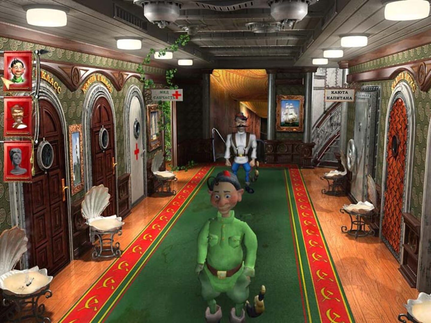 Like the previous games in the series, Zoloto Partii (“The Gold of the Party”) is a puzzle-solving adventure, mainly focusing on inventory-based puzzles. Graphically, it follows the template introduced in the previous game. The title and the setting are an obvious parody on James Bond; but the game also pays homage to Leisure Suit Larry: Love for Sail, also the seventh installment in the famous humorous adventure game series; like Love for Sail, it is set on a ship, and revolves around “pleasing” young sexy women.