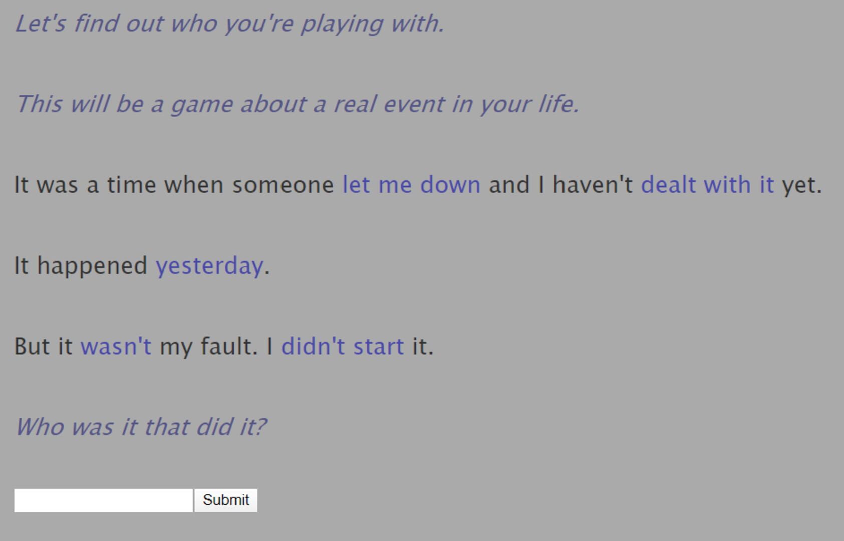 Player 2 is a game about resolving conflicts with others that involves the real experiences of the player as an experiment into exoludic games.