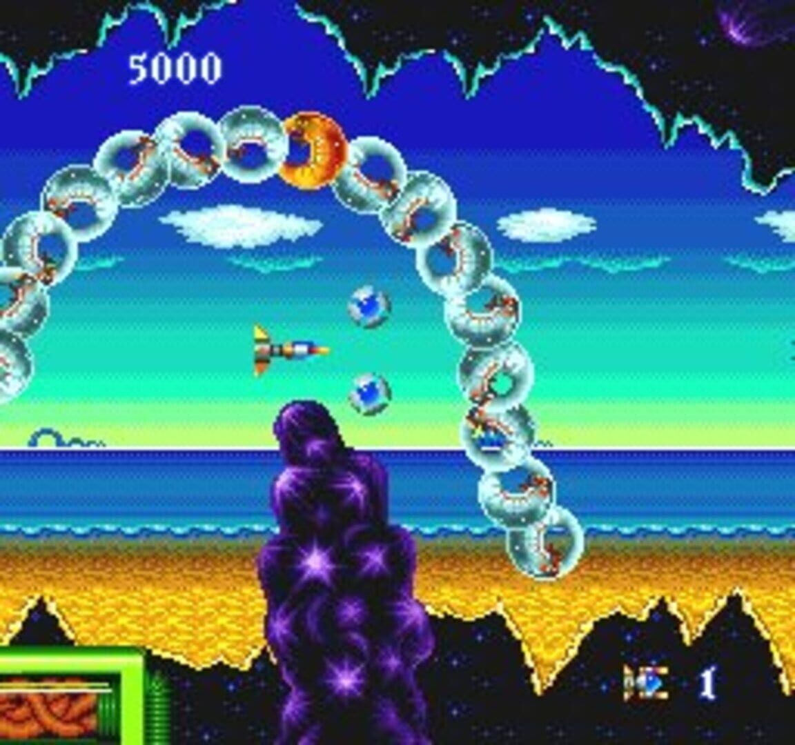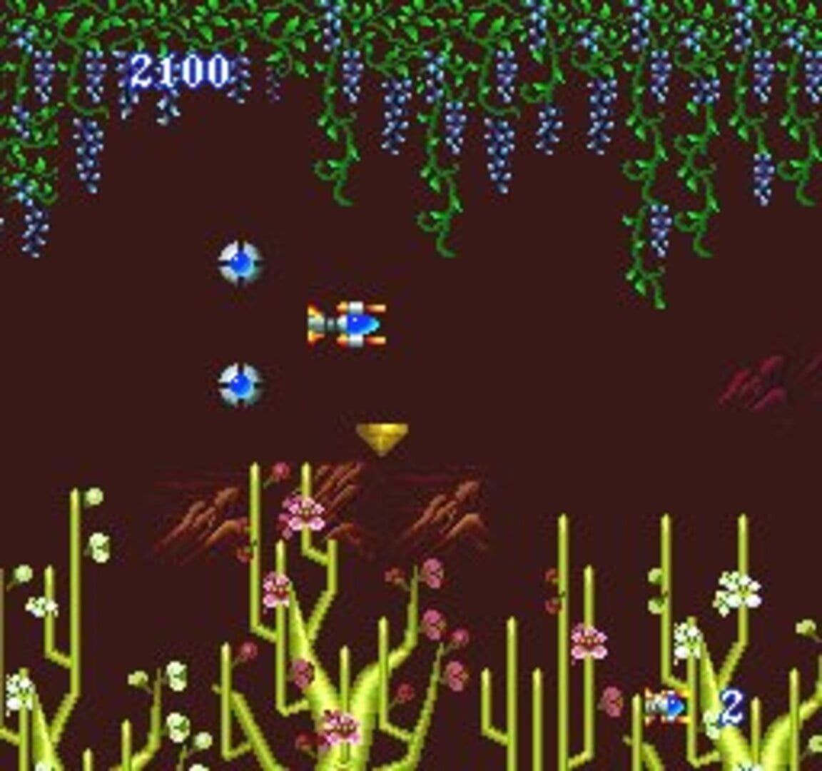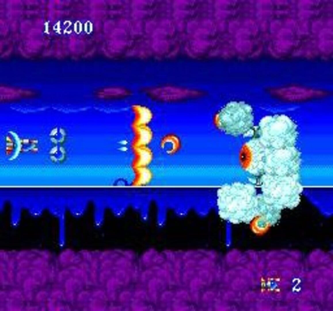 This is a side-scrolling shooter played in a world created from the mind of a twisted demon. Your soul has suddenly wandered into that evil world that exists in every person’s heart. The only way out is to blast your way past the grotesque creatures that block your path in five “causes” (stages). You must face the dangers of this psychedelic world by making full use of three shot types and the satellite option. With power-ups, you can change your shots to a wide-coverage beam, a satellite-generated laser and more. Each shot type can be powered up to three levels. You can also block enemy fire by rotating the satellites to a desired position. How you use these features will be the key to successfully escaping this strange and surreal world