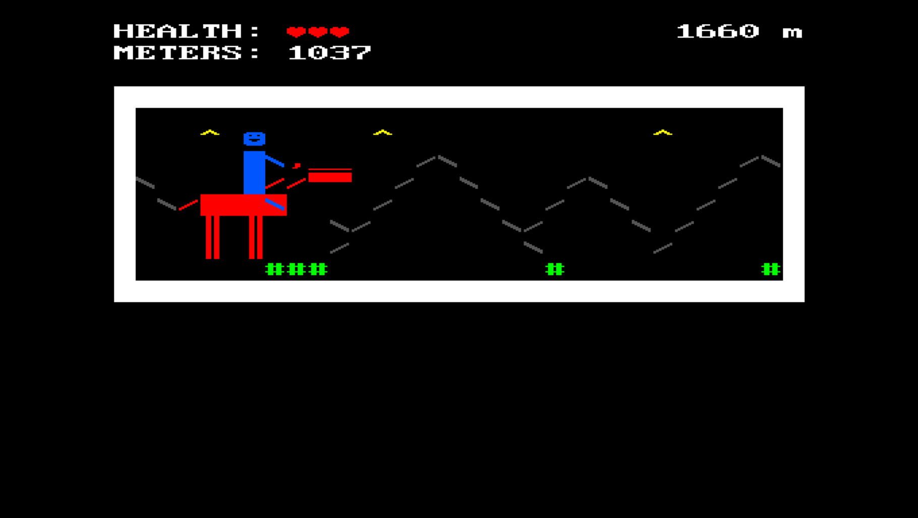 Jump through treacherous obstacles atop your trusty Horsey. Can you make it to the end of the 2,420 meter derby? If not, you can just create your own level using the built-in level builder. Do you hate the built-in level builder? Well then just open your level up in your favorite .txt editor and type away.