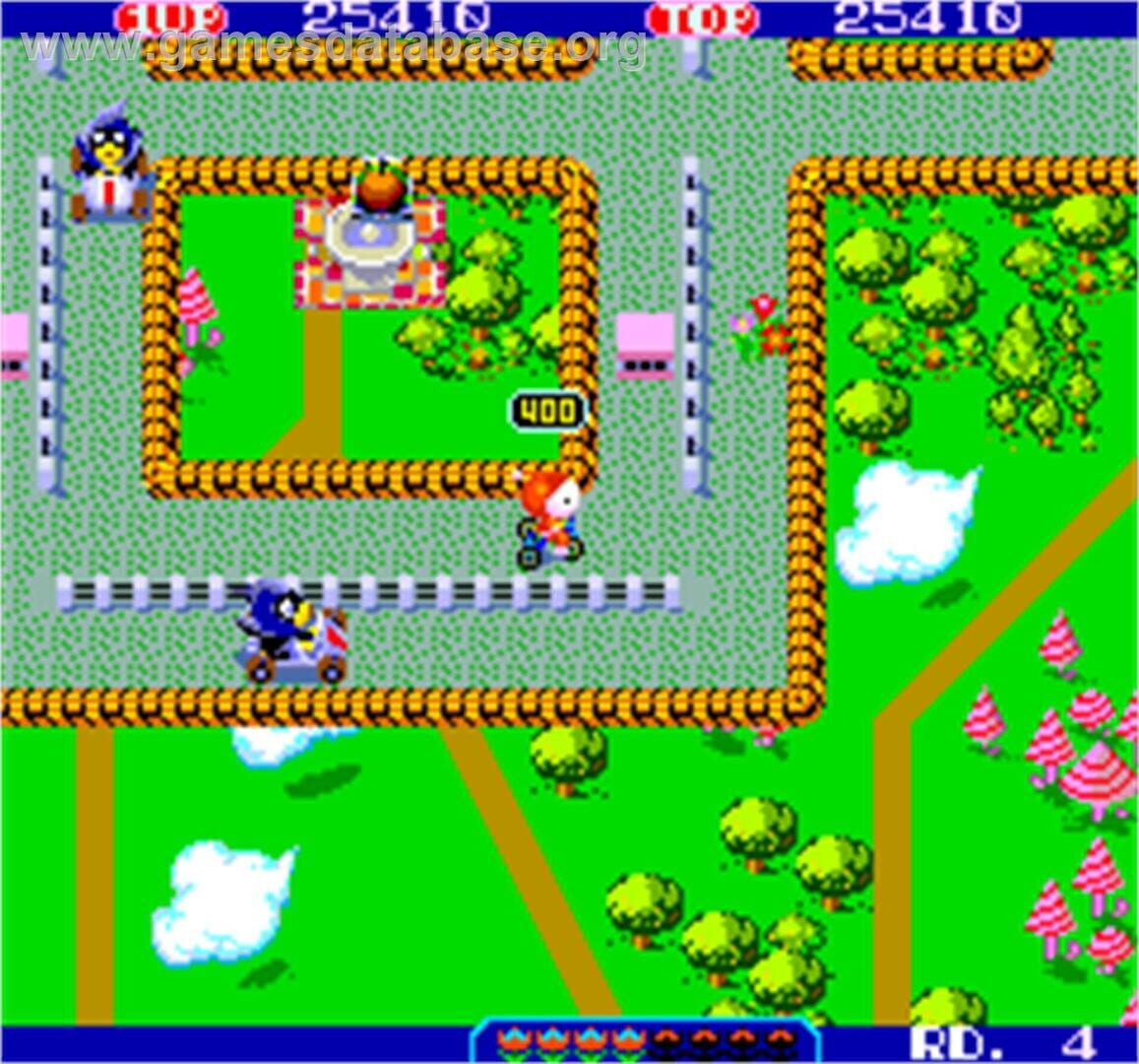 Most of the maze paths are separated into two lanes, with a springy elastic fence separating them. This fence is the key to playing the game, as players can jump into it, allowing them to squeeze past oncoming enemies in the same lane. Also, enemies on the opposite side of the fence can be sent flying from the track. Solid blocks also feature, and these can be pushed into enemies to destroy them.