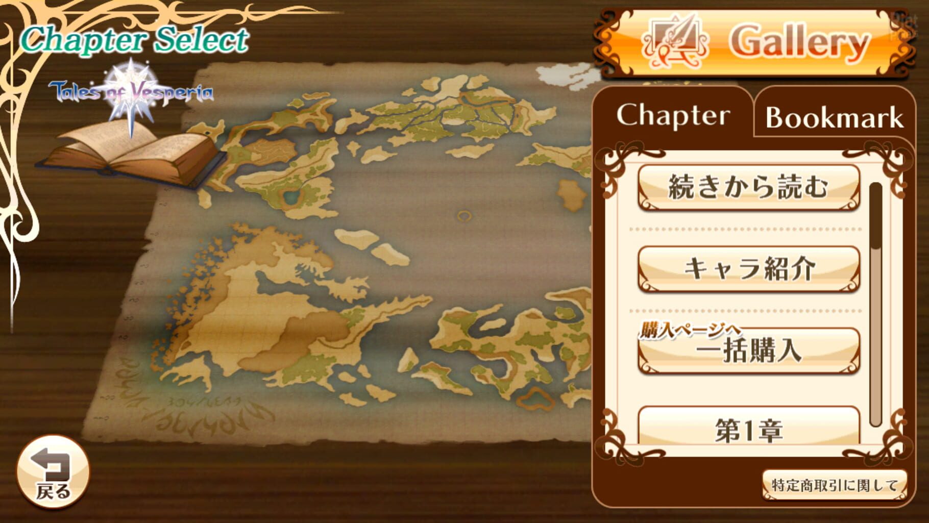 Tales of Bibliotheca is a scenario, collection-style mobile app game for the iOS that provides an alternative experience to existing games in the Tales series. Chapters 1-12 of the app covers Tales of Vesperia, and while the game has its own unique battle system and original scenes, each of the chapters contains new illustrations and scenarios from notable scenes in the game.