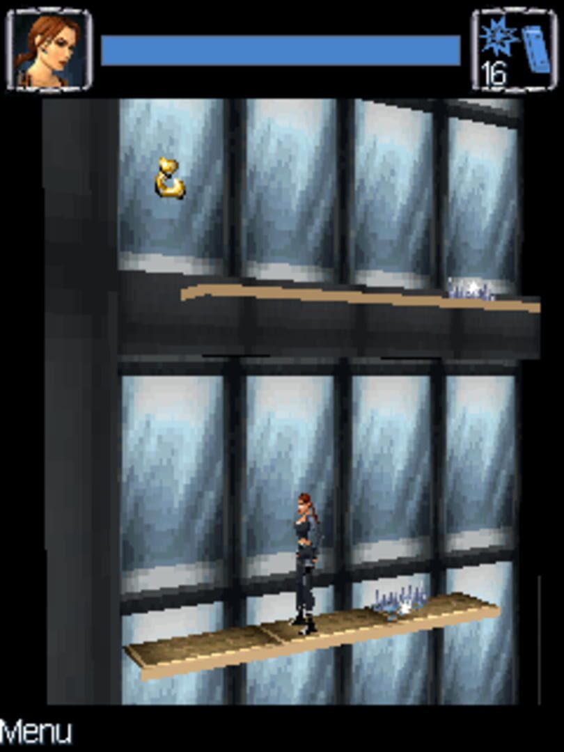 The J2ME version of Tomb Raider: Legend takes place in Tokyo, which was the third location of the original game. The game is a side-scrolling platformer with polygonal 3D graphics. Most of the gameplay involves running left and right, jumping between platforms and shooting the various Yakuza members that stand in Lara’s way. Obstacles such as electric cables and laser defense systems have to be avoided either by jumping over or rolling under. Sometimes Lara has to swing around poles or use her grappling hook to reach far off platforms. The grappling hook can also be used to swing into and knock out enemies. The gunfights are quite simple and only Lara’s regular handgun can be used. Bullets can be dodged by crouching but the enemies can do the same.