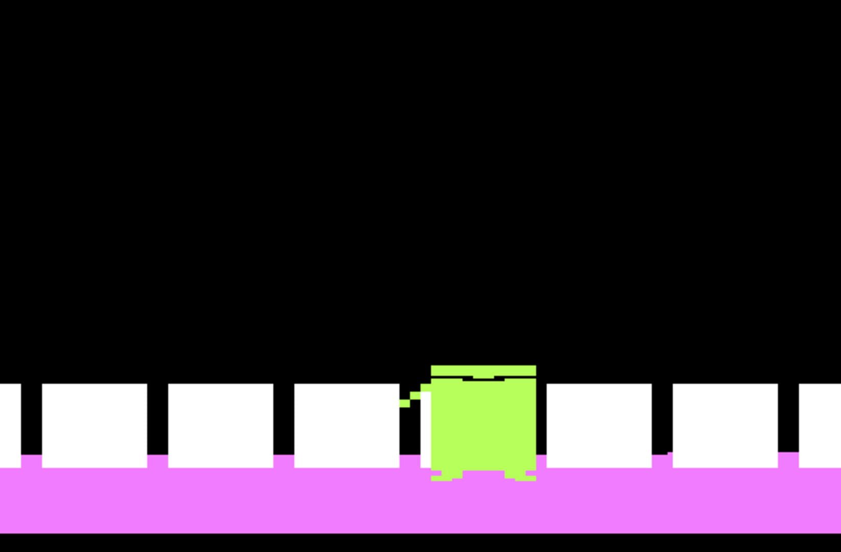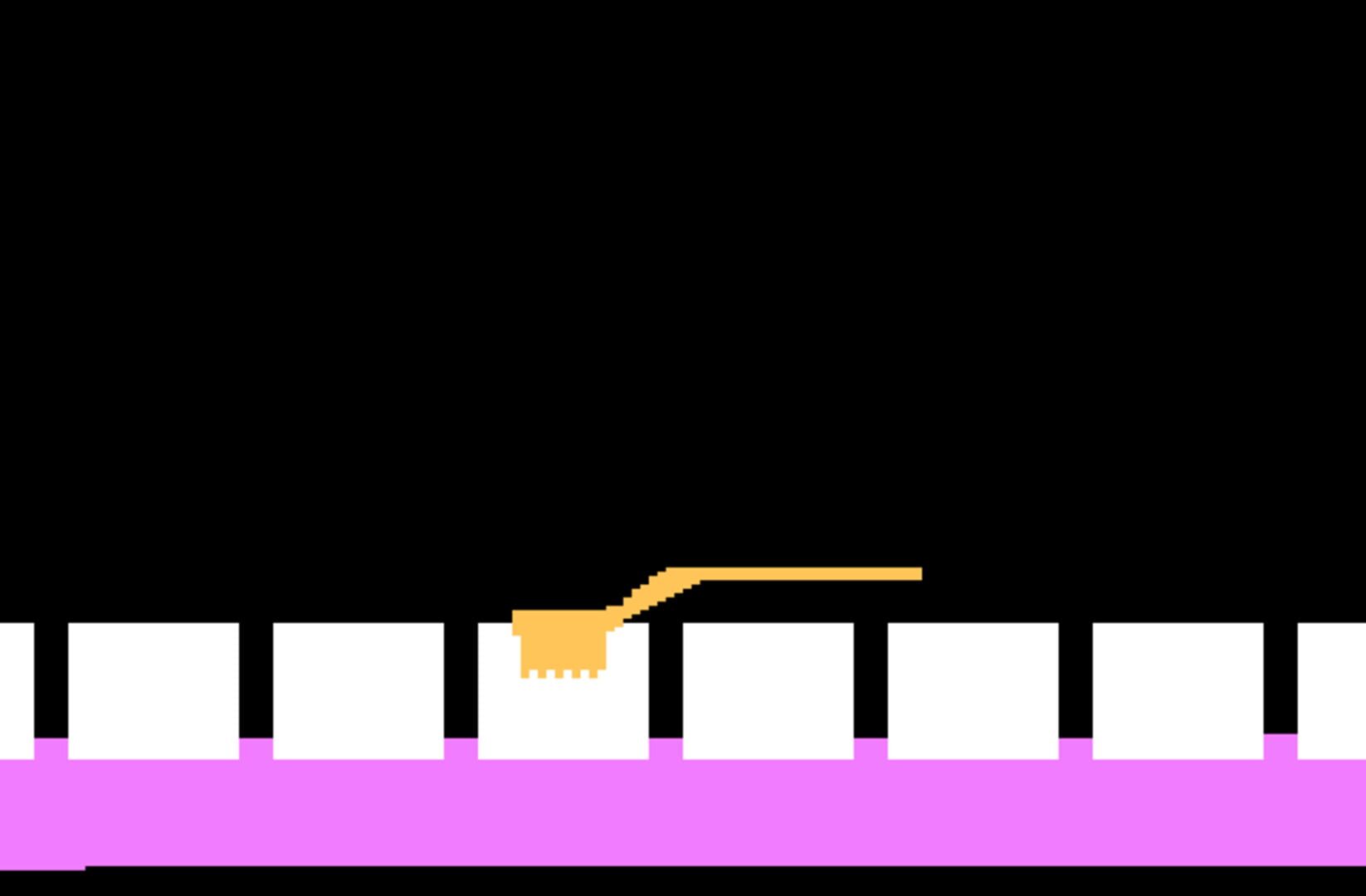 In this game the player must prevent objects dropping from the top of the screen from reaching the bottom by positioning their character directly under the falling objects. The player’s character is a small smiling face carrying a strand of dental floss above its head. They must prevent the snack squares from reaching the row of white teeth along the bottom of the screen; repeated hits by the snacks cause the teeth to blink and disappear from tooth decay.