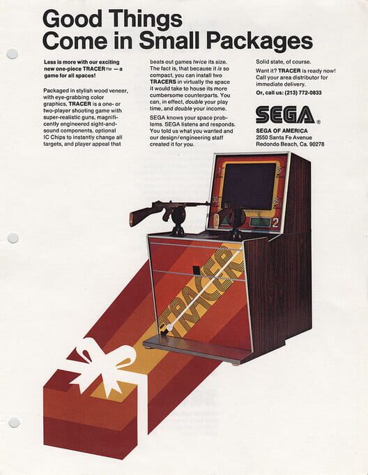 Sega Tracer released in 1976 as a compact version of its predecessor Bullet Mark. These early light gun games provided a bridge between electro-mechanical arcade and early video games.