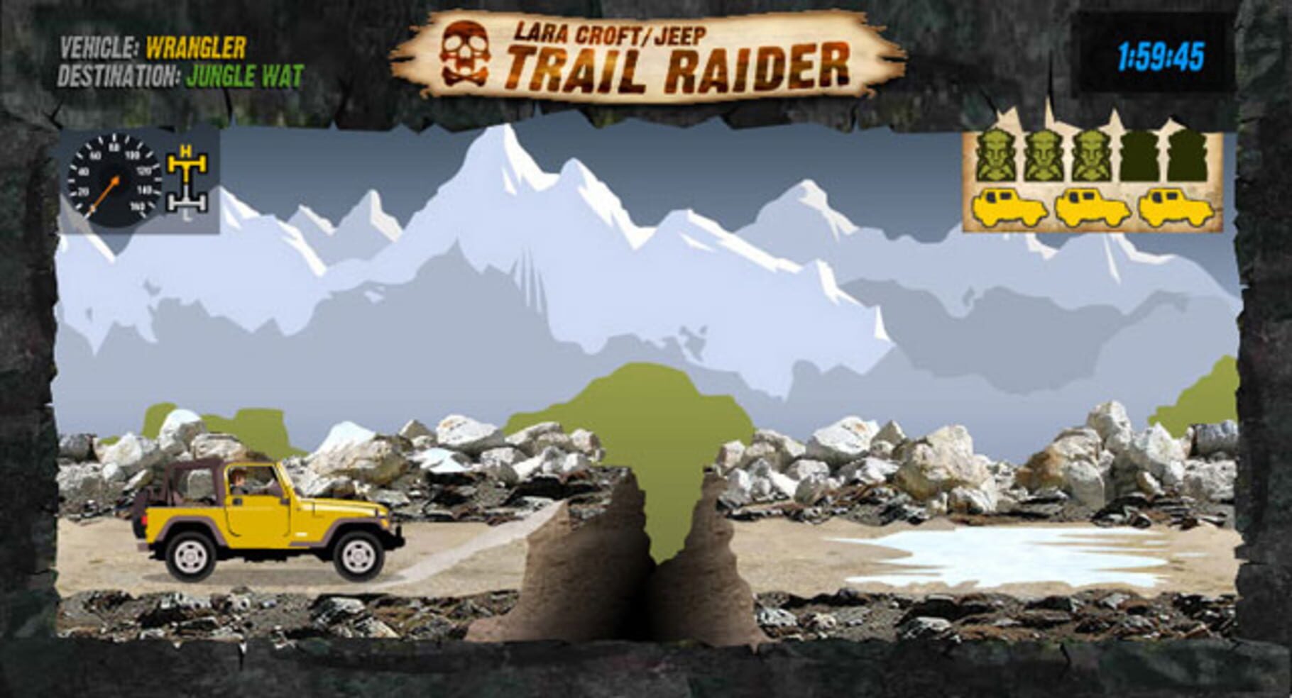 Trail Raider is a promotional flash game for Tomb Raider and Chrysler/Jeep, coinciding with the release of Tomb Raider: Legend. The game utilizes an easy to play adventure game that demonstrate new Jeep four wheel drive technologies in the new ’06 models as well as leveraging the Tomb Raider and Lara Croft brand. The game has three levels. On level 1 the player drives Jeep Wrangler, Level 2 has Jeep Commander, and on level 3 the game lets the player choose the Jeep vehicles. The goal of the game is to finish the levels as fast as possible.